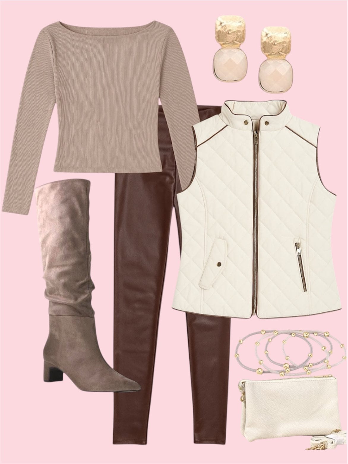 From crisp southern mornings to golden autumn evenings, this look is your go-to for cozy sophistication. Our Quilted Cream Vest adds the perfect touch of texture, while the buttery-soft Taupe Top keeps things neutral and warm. Paired with our luxe brown Donovan faux leather pants, it’s a timeless combination that flatters every figure.